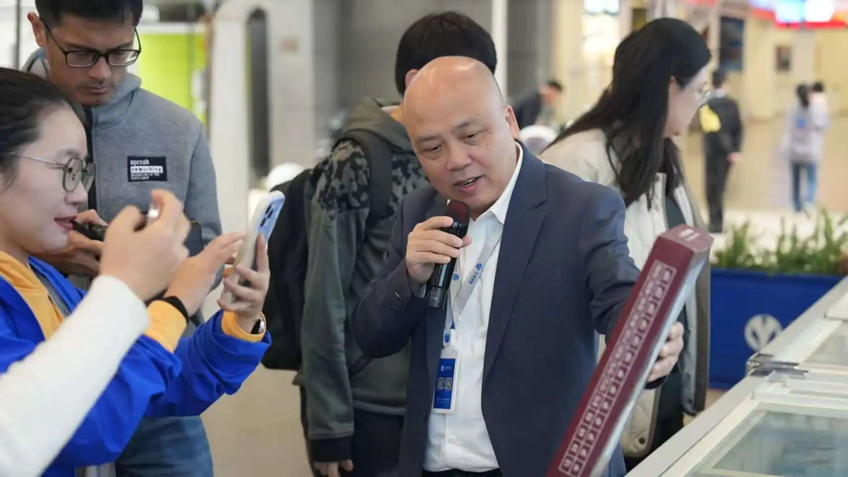 园区中庭,“链通全球,食惠万家”全球冻品囤货节正值高潮。园区内近50家优质商户携明星产品亮相,更有园区冷库内2.5万款产品面向市场,吸引了近千名本地餐饮和华南二/三批市场的采购商到场参与。而这只是玉湖冷链组织的常态化采销对接活动的一个缩影。